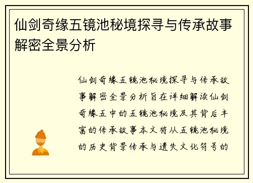 仙剑奇缘五镜池秘境探寻与传承故事解密全景分析