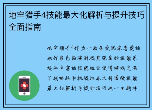 地牢猎手4技能最大化解析与提升技巧全面指南